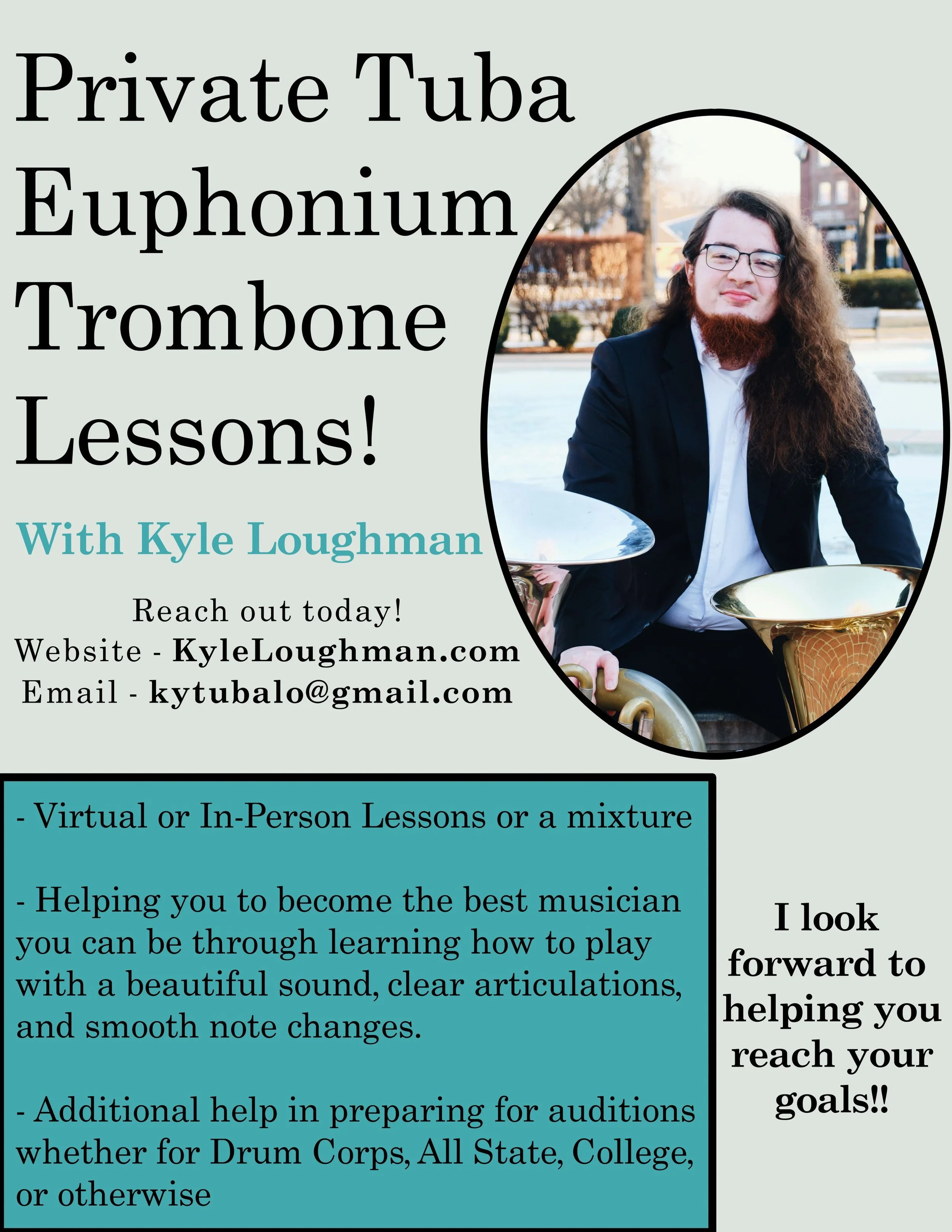 I teach mostly Musicians who play Low Brass Instruments(Tuba, Euphonium, Trombone), but I also offer coaching for a variety of musical topics including Music Theory, Composition, and History.